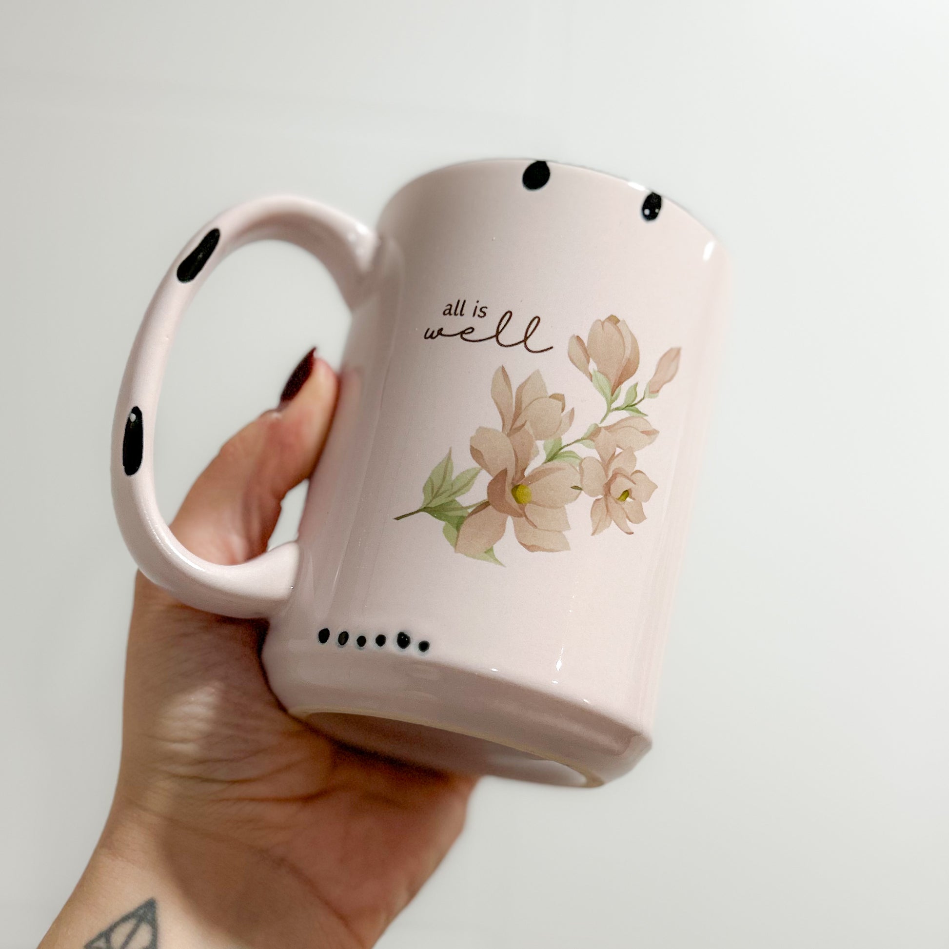 A 15oz mug artfully chipped with pastel hues. Dishwasher safe.