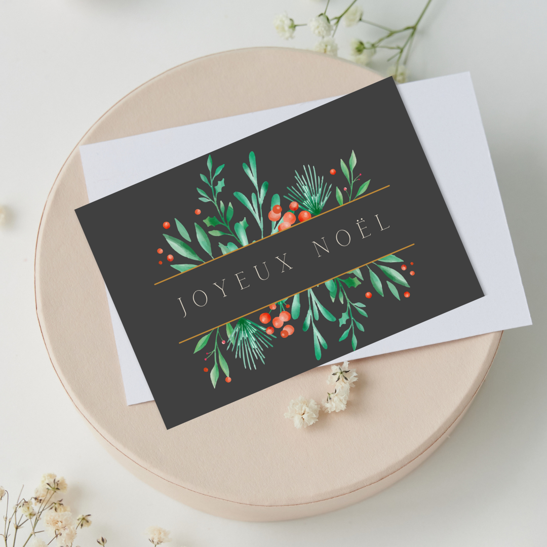 Tarjeta navideña: estilo postal con un diseño a juego en un lado que incluye espacio para una nota escrita a mano. Sobre incluido.