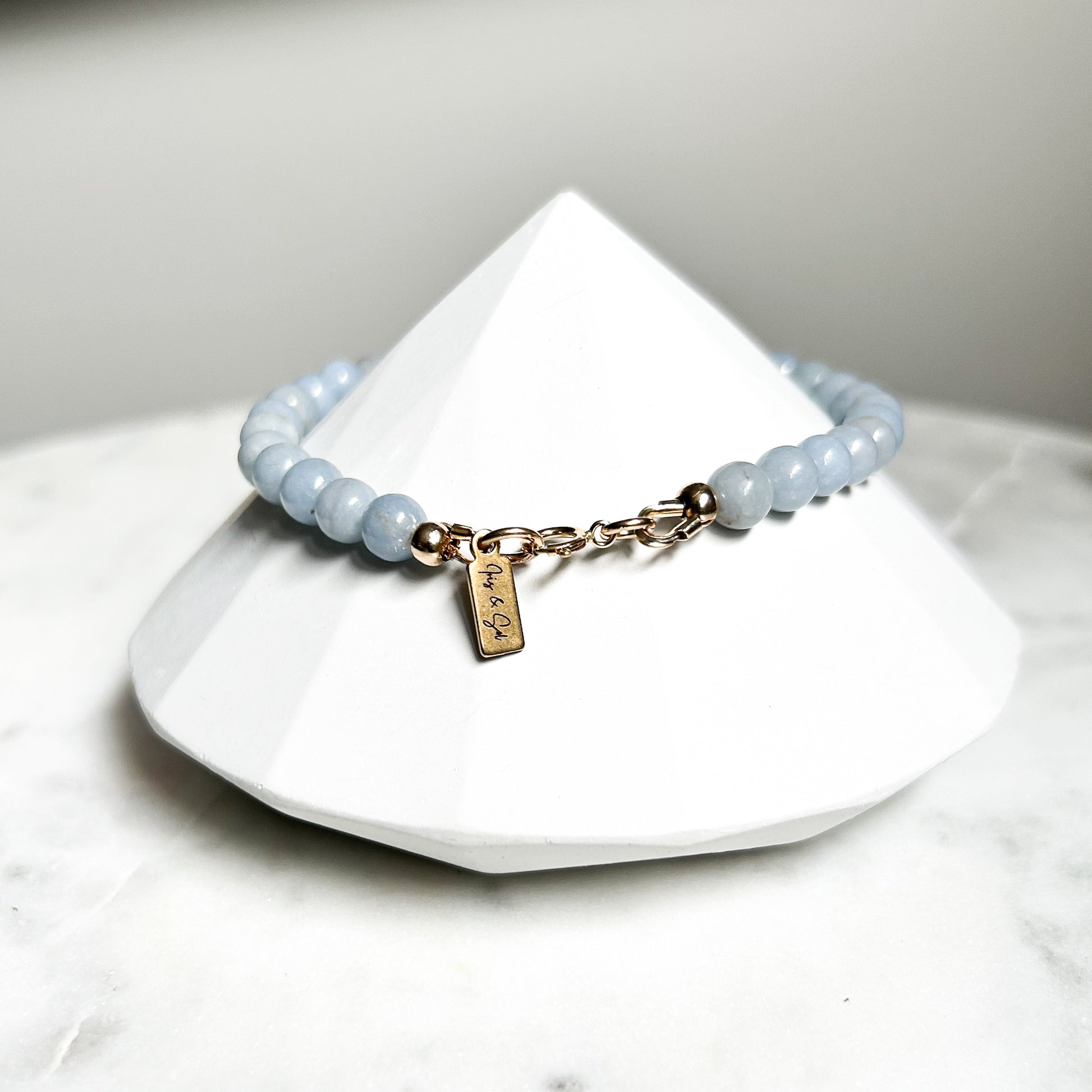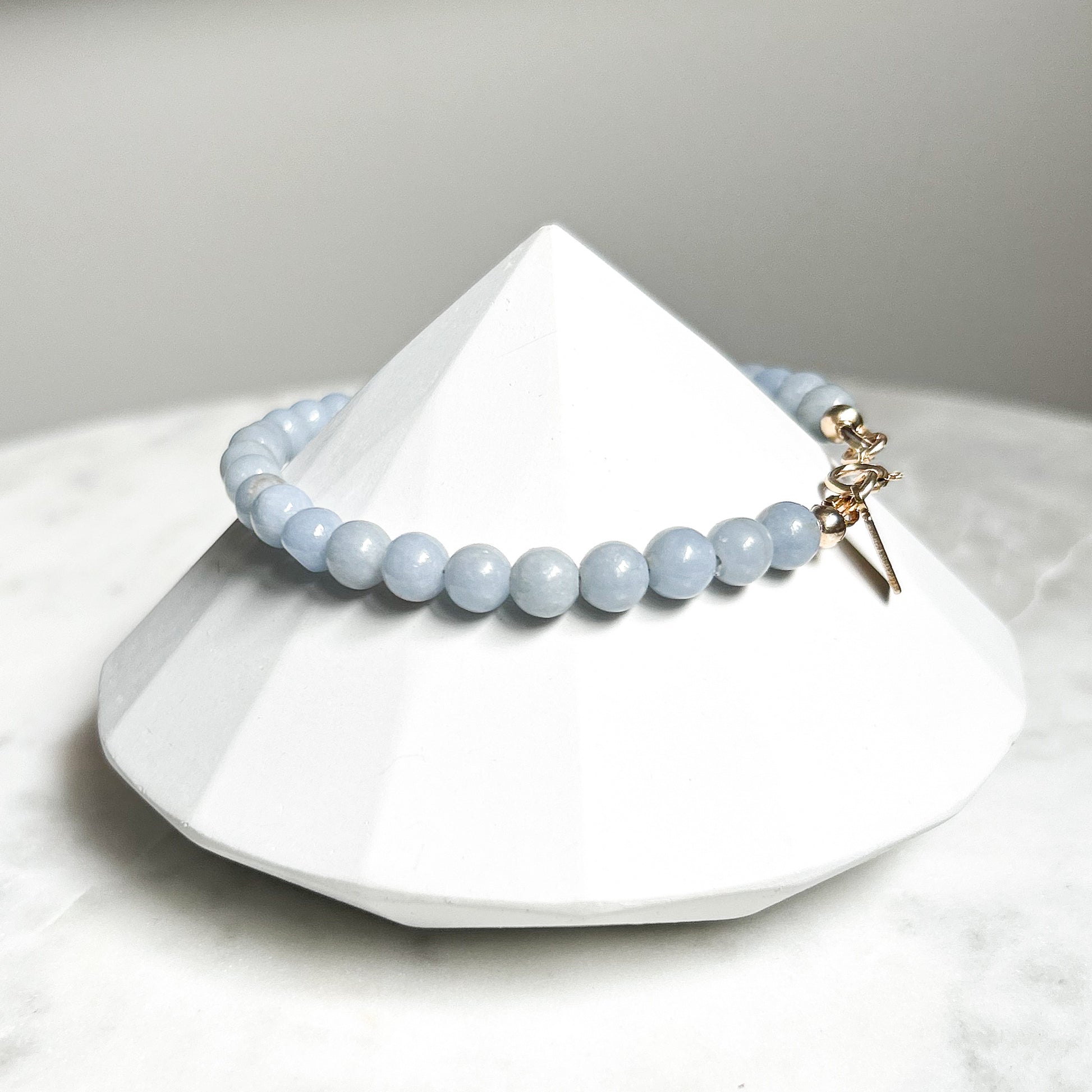 Handmade bracelet crafted with 6mm angelite gemstones, known for transmitting peaceful and serene vibes to fill your heart with compassion and forgiveness.