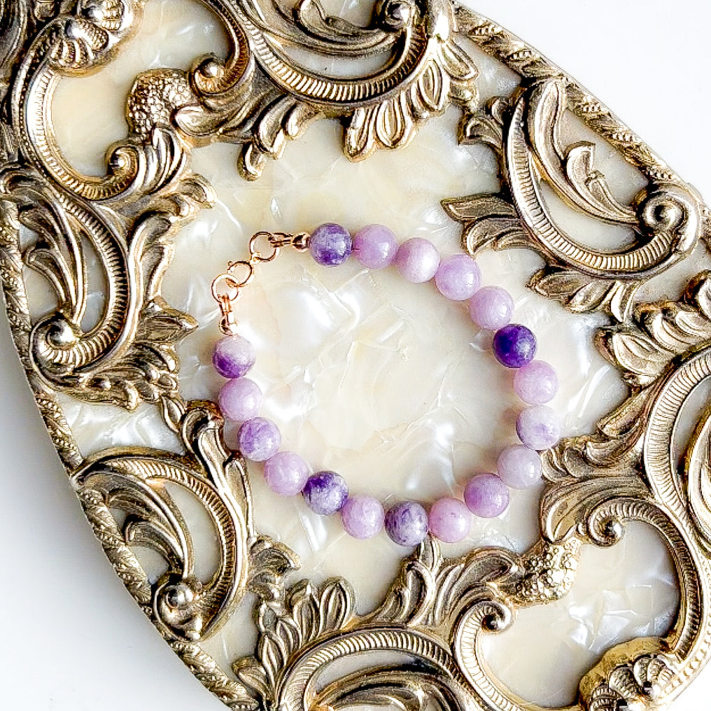 Handmade bracelet crafted with 8mm lepidolite gemstones, known for its calming and soothing essence bringing mental and emotional relief when faced with stress of life.