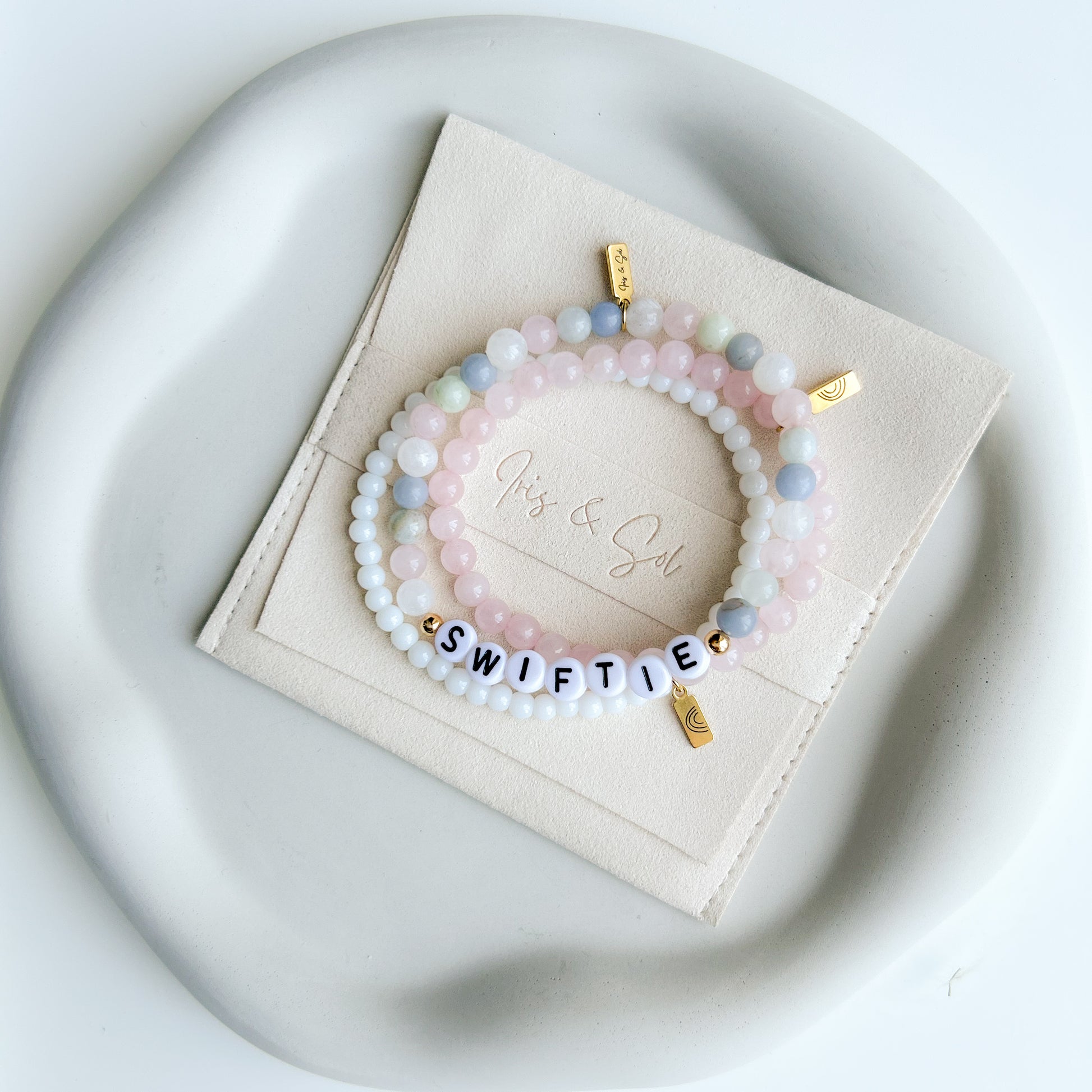 Includes: Swiftie Morganite/Rose Quartz/Aqua bracelet, Rose Quartz bracelet and White Agate bracelet.