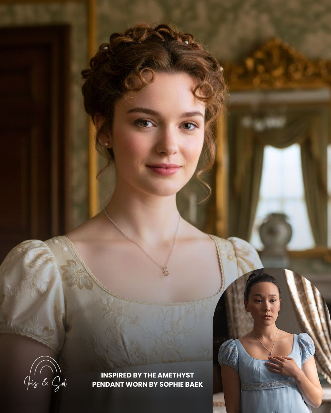 Canadian sourced materials. 925 sterling silver 18inch chain with a preciosa amethyst crystal pendant. Inspired by the amethyst necklace worn by Sophie Baek in Bridgerton season 4.